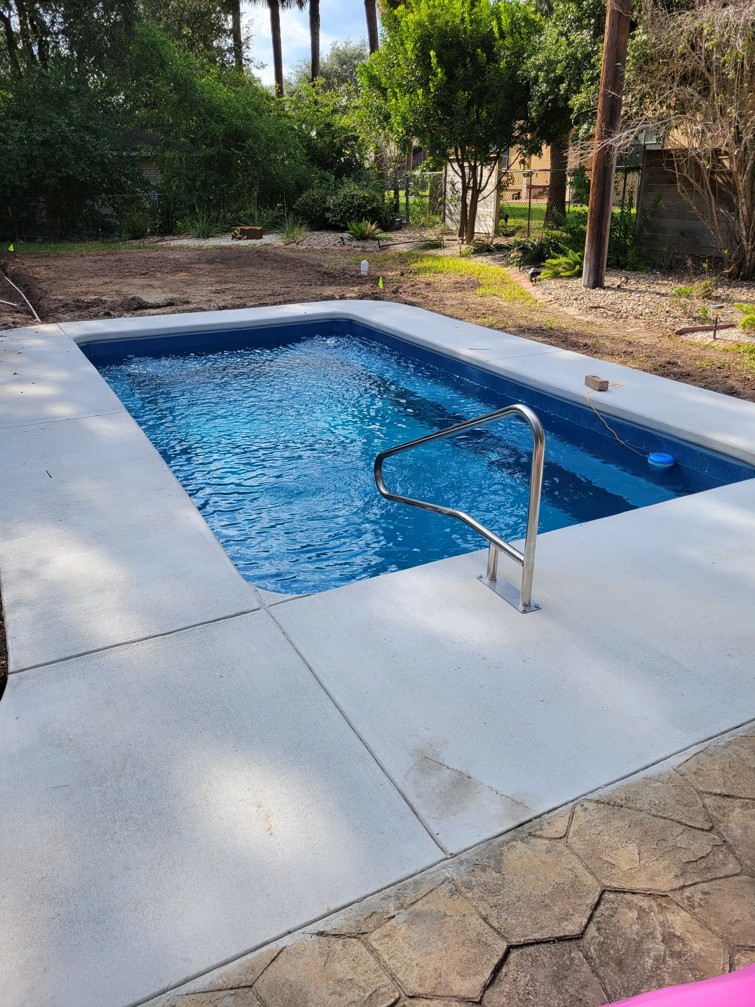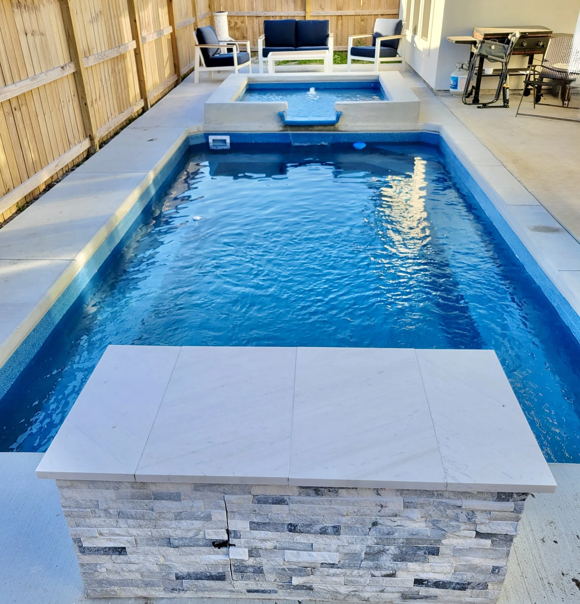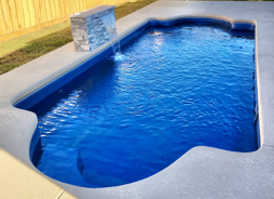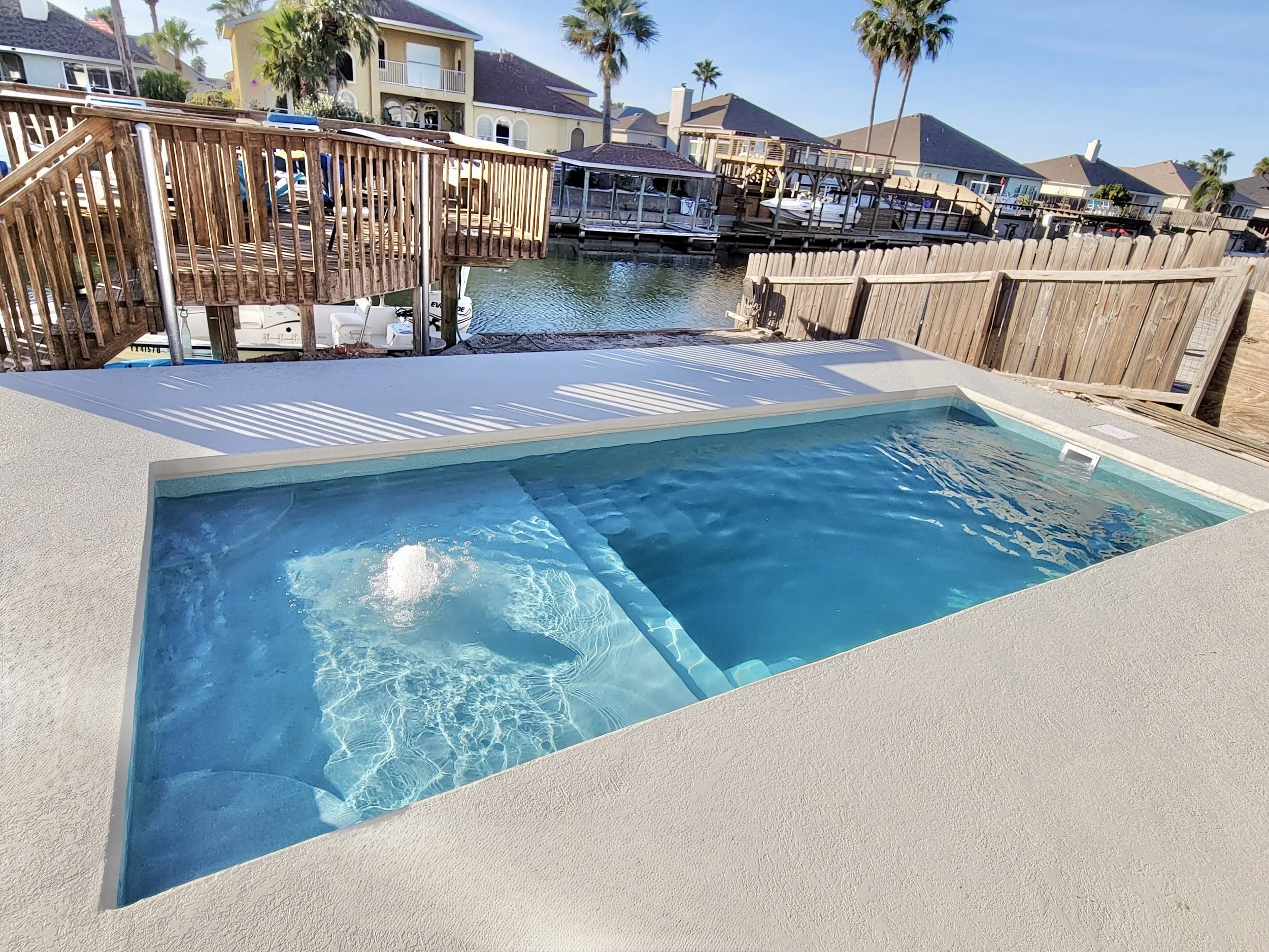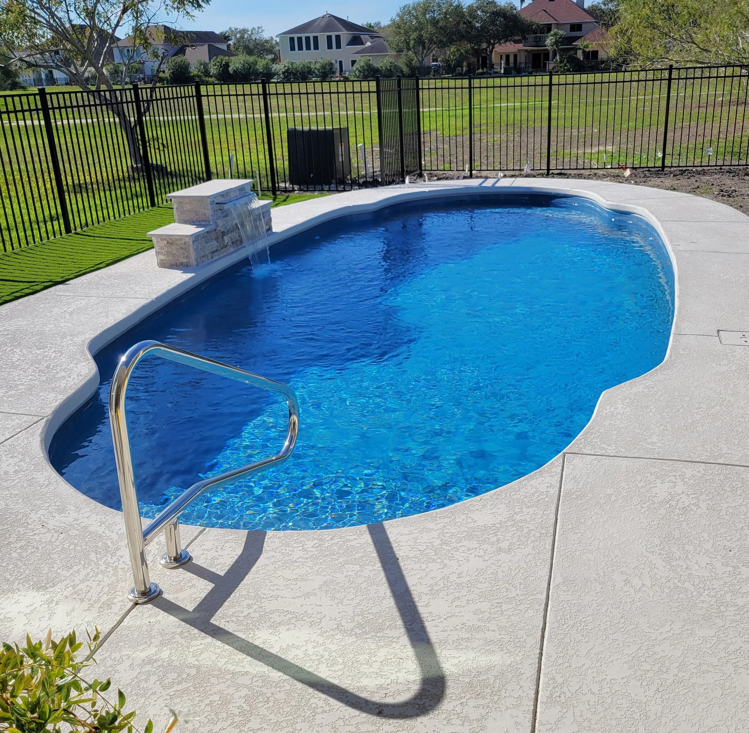 Optional surrounds and features such as decking, fencing, turf, and travertine coping